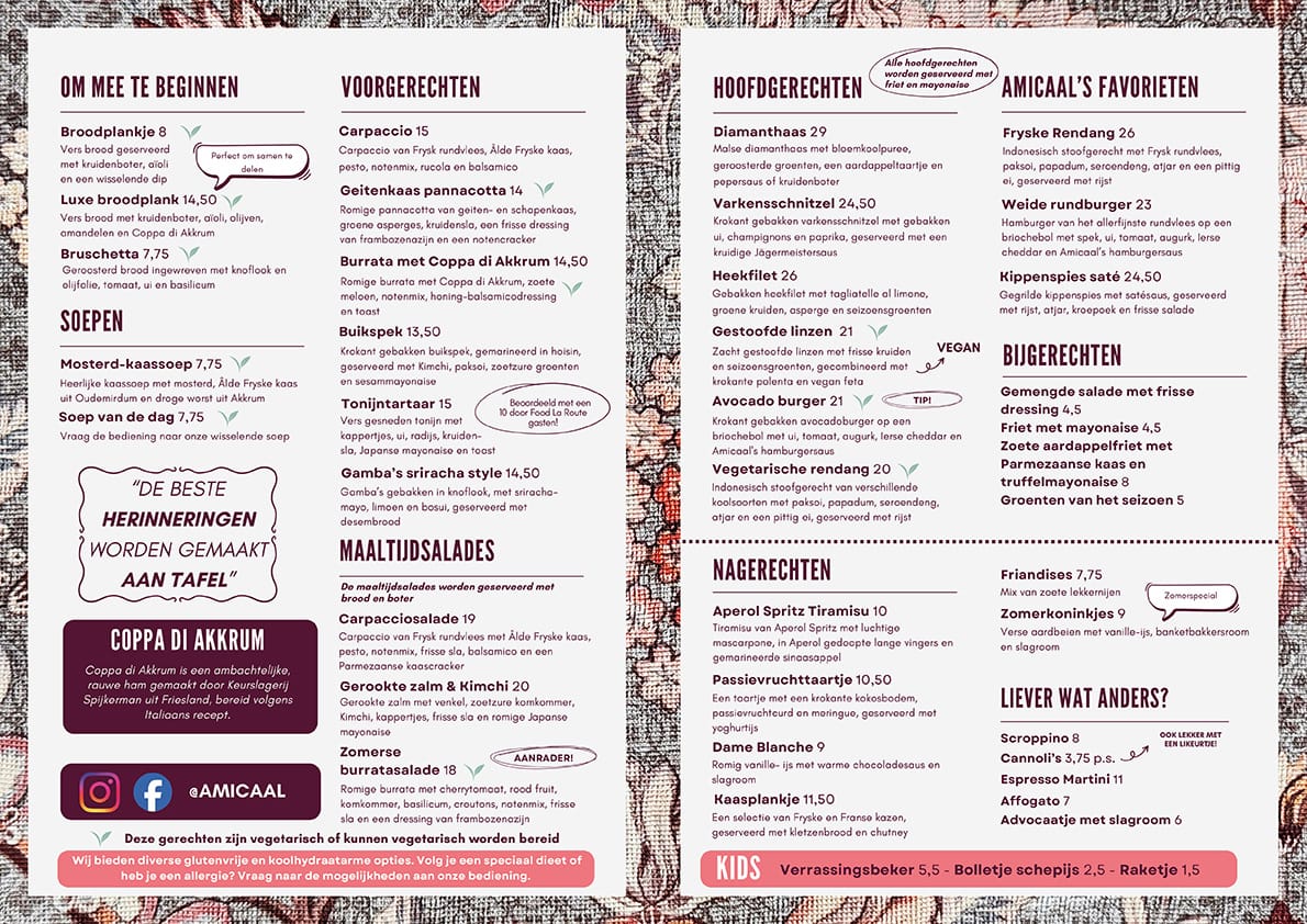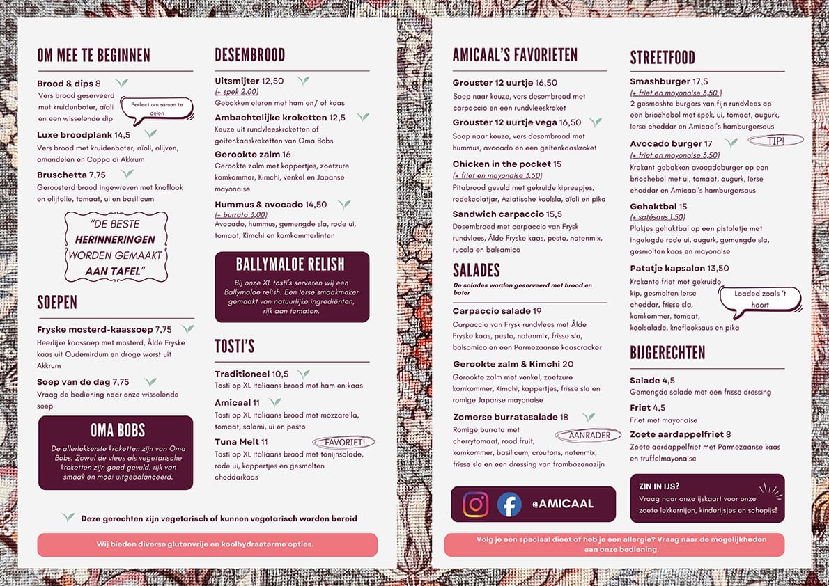 Lekker uit eten in Grou? Op onze kaart vind je klassieke gerechten met een wereldse twist. We vernieuwen het menu elk kwartaal, maar enkele grote hits zie je op elke kaart weer terug. Neem onze sandwich carpaccio, chicken in the pocket of het broodje beenham. Daar komen mensen speciaal voor en we stellen onze gasten niet teleur. De gerechten op onze kaart zijn vers en gemaakt van lokaal geproduceerde seizoensproducten. Onze dagvangst en steak van de week zijn altijd de beste stukken vis en vlees die onze regionale partners in huis hebben. Geniet ervan!